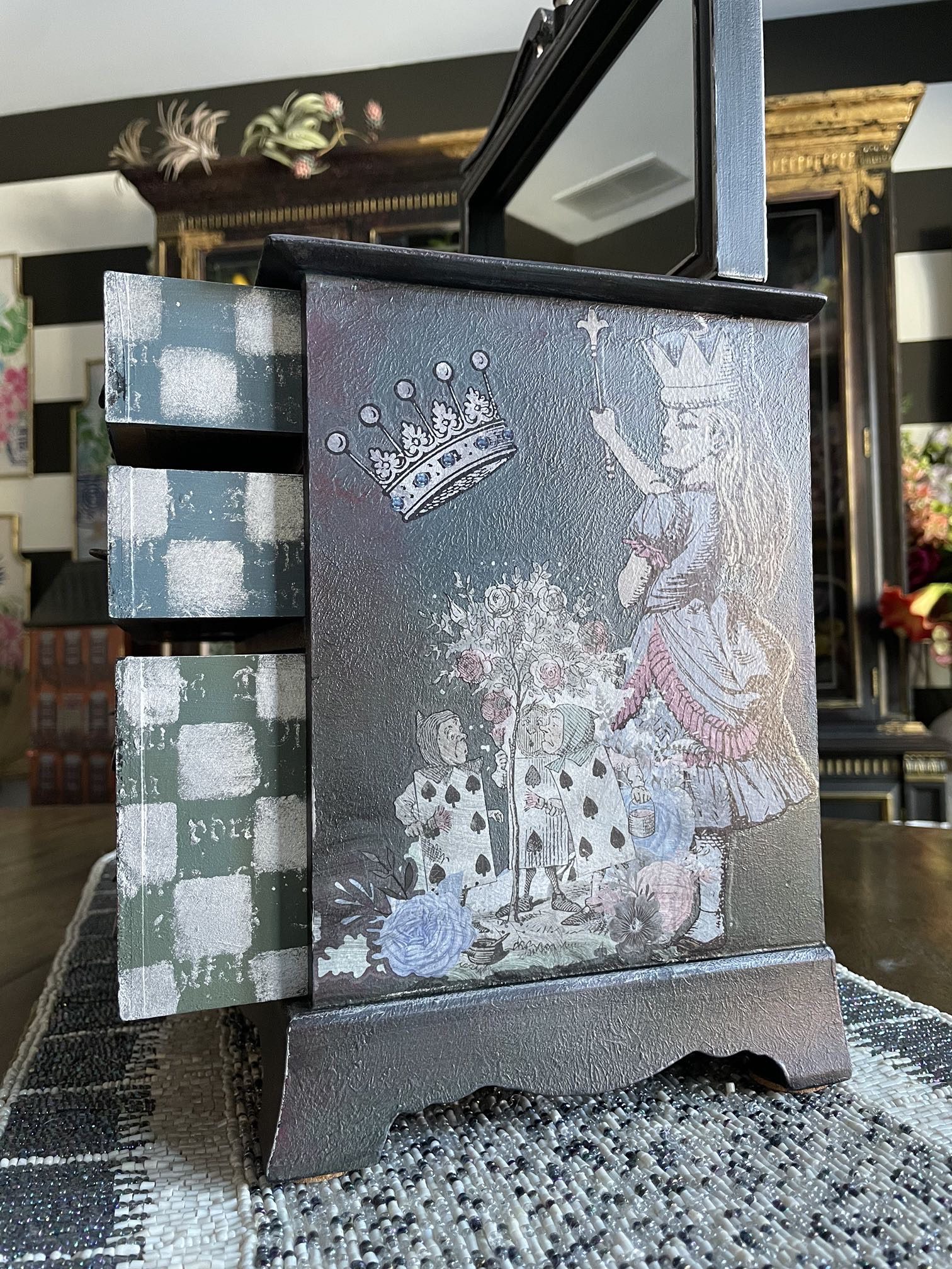 Step into Wonderland every time you open this beautifully restored vintage jewelry box, uniquely painted and decorated with iconic scenes from Alice in Wonderland. This is a one-of-a-kind statement piece perfect for collectors, fantasy lovers, or anyone who enjoys whimsical décor.