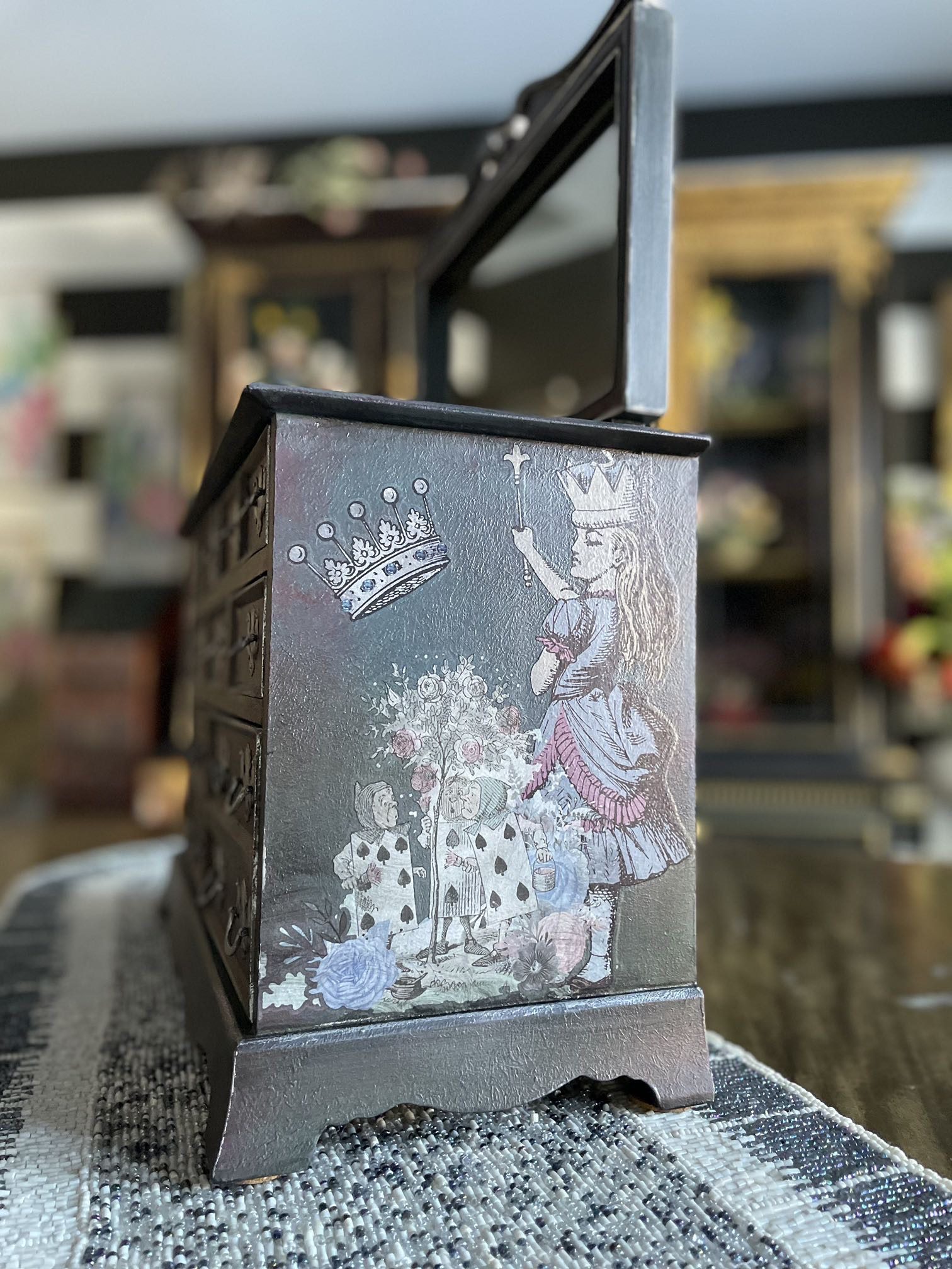 • Hand-painted finish in deep blue, green, and red tones with an aged, mysterious Wonderland feel