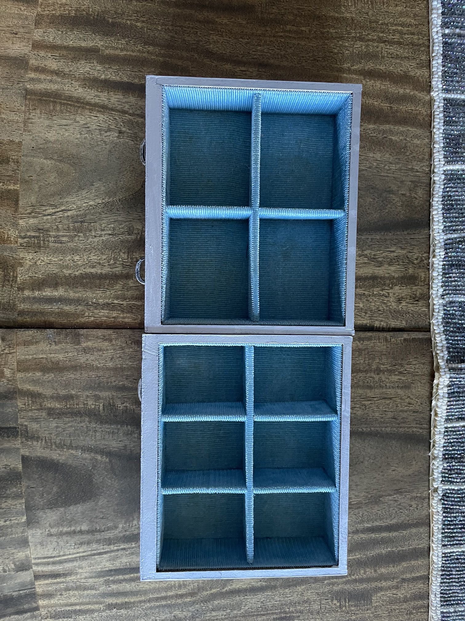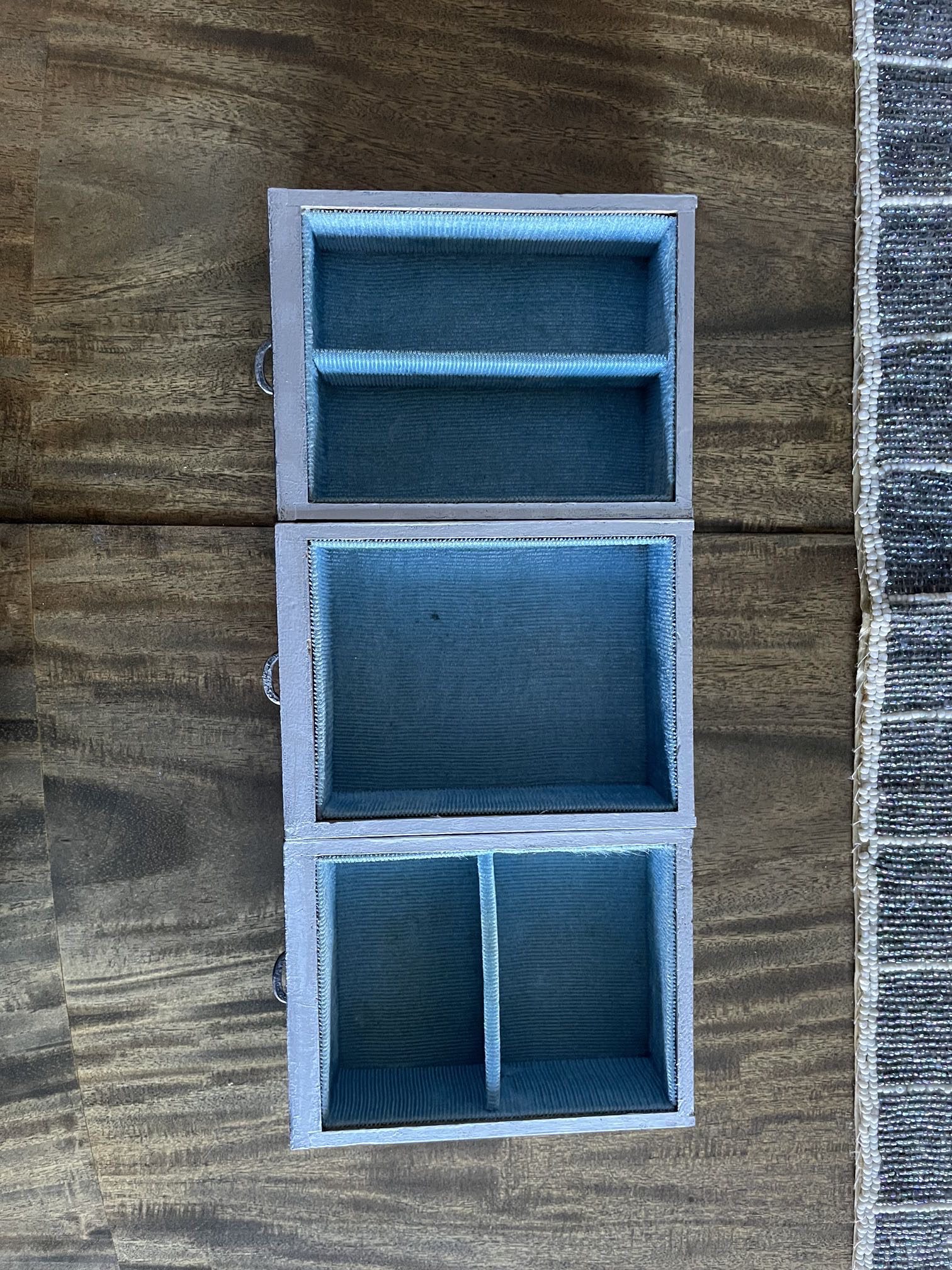 • 7 velvet-lined drawers in a soft light blue, perfect for storing rings, earrings, necklaces, and keepsakes