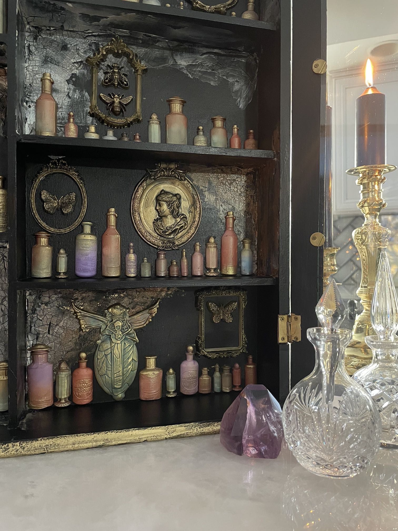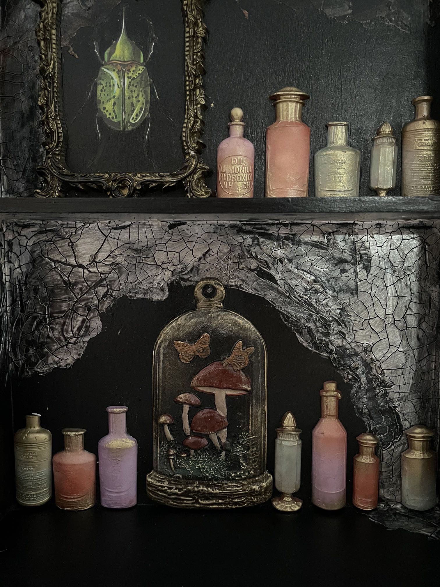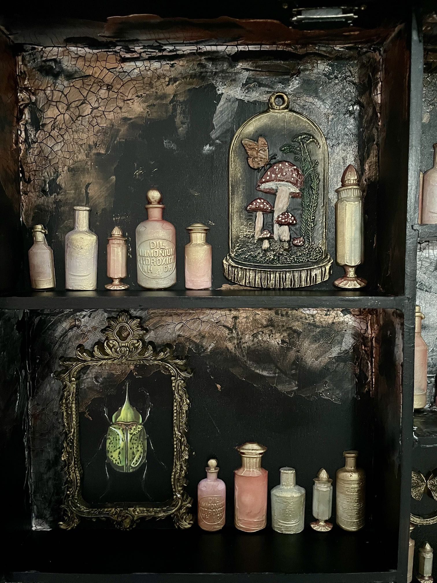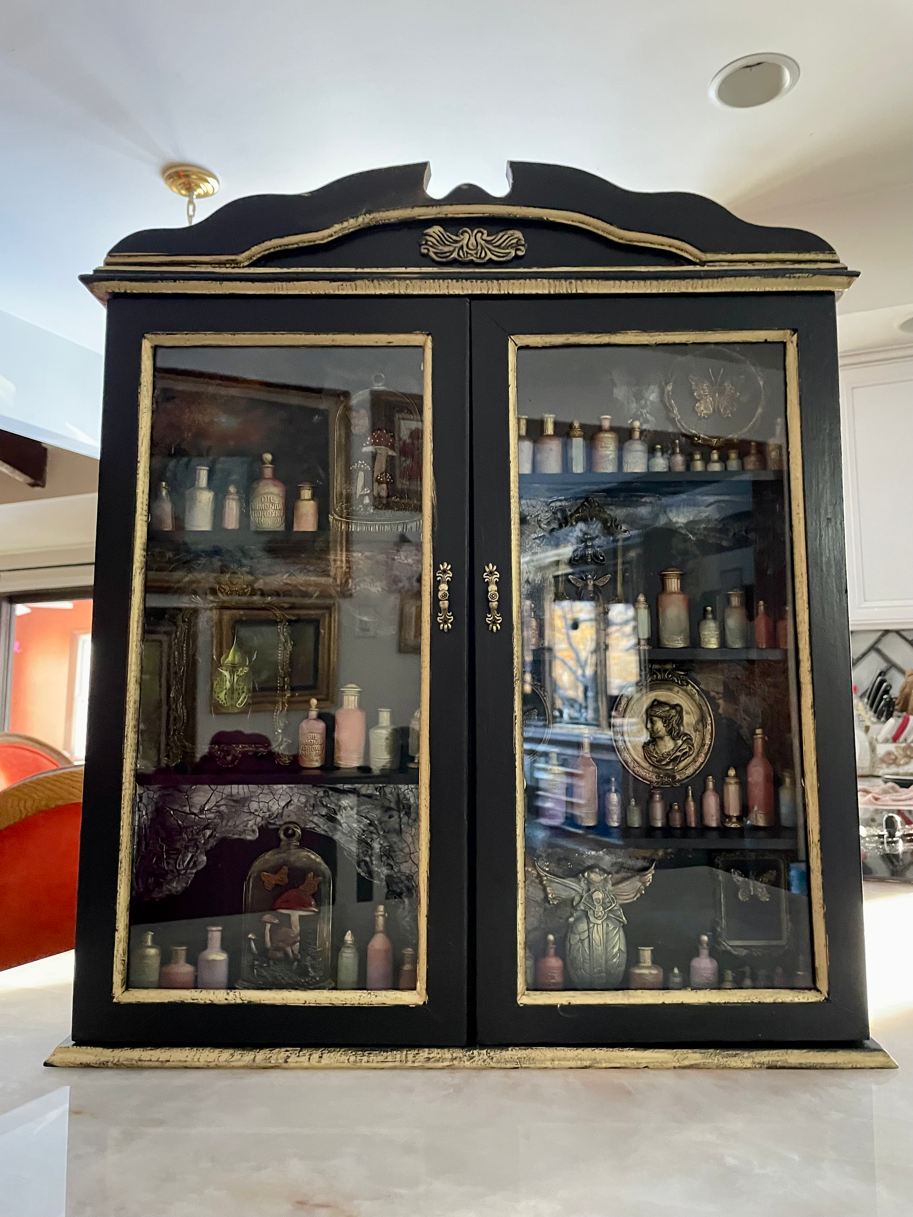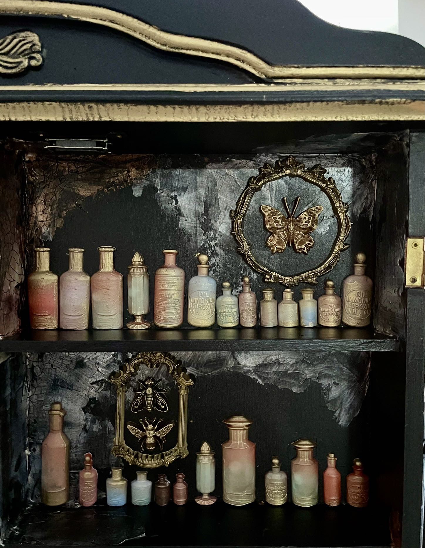 Painted in a deep black and accented with antique gold trim, this cabinet features a weathered crackle interior that reveals layers of history and intrigue. Inside, delicate moulded bottles, insects, ornate frames, and alchemical findings create a hauntingly beautiful tableau — as if each shelf holds secrets from a forgotten apothecary.