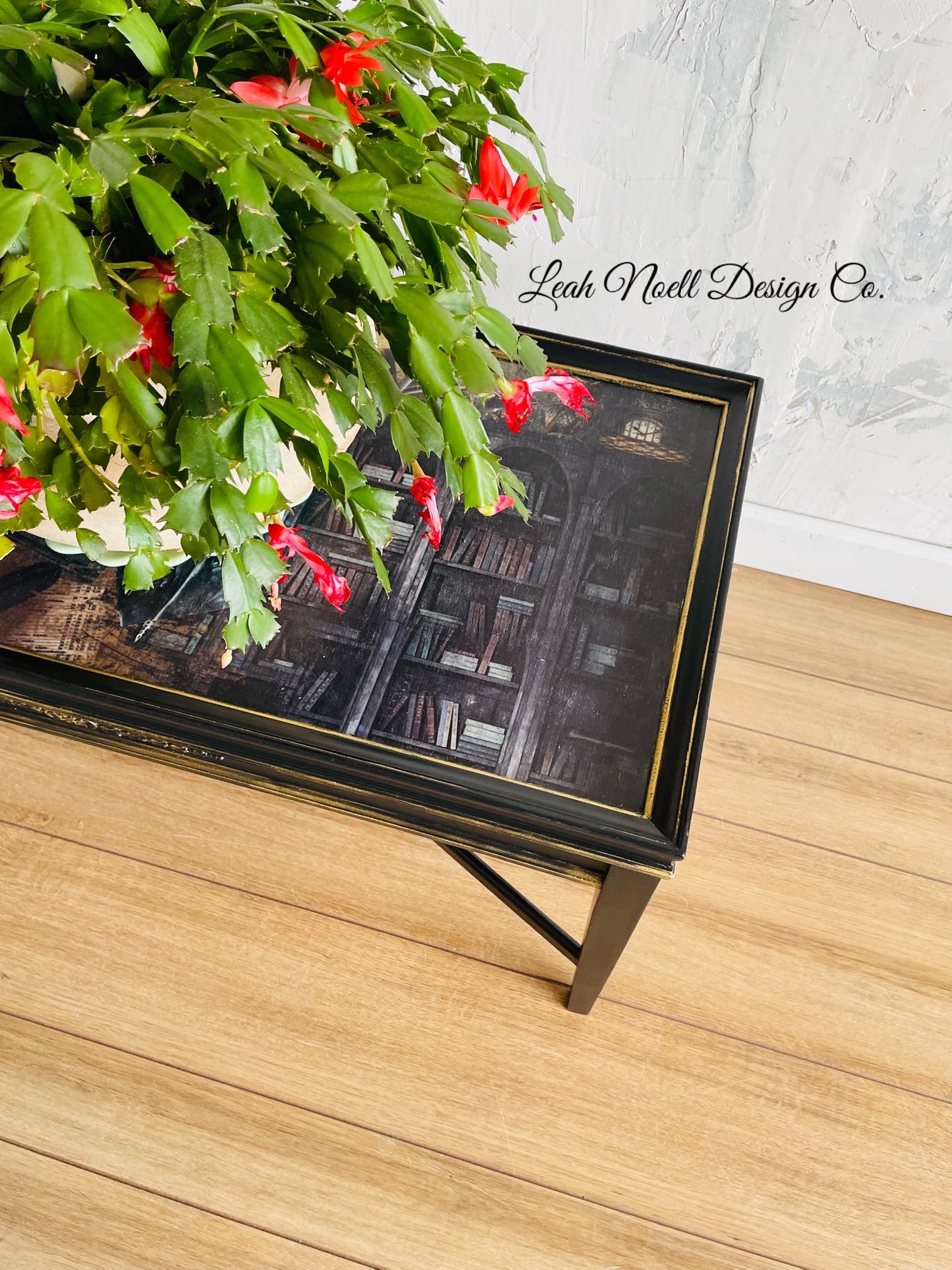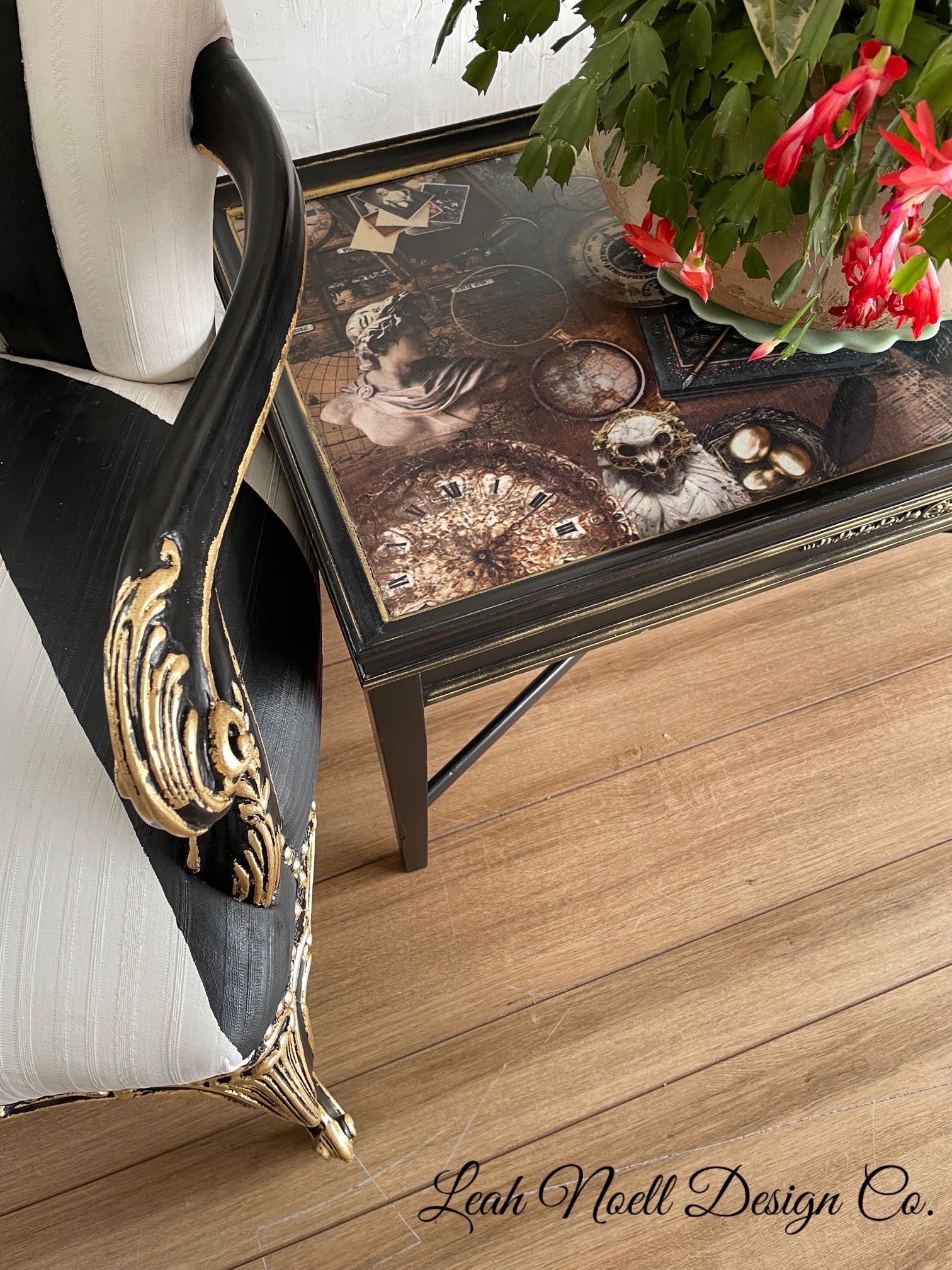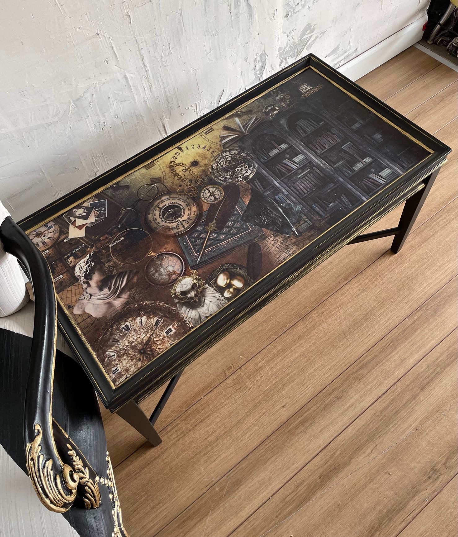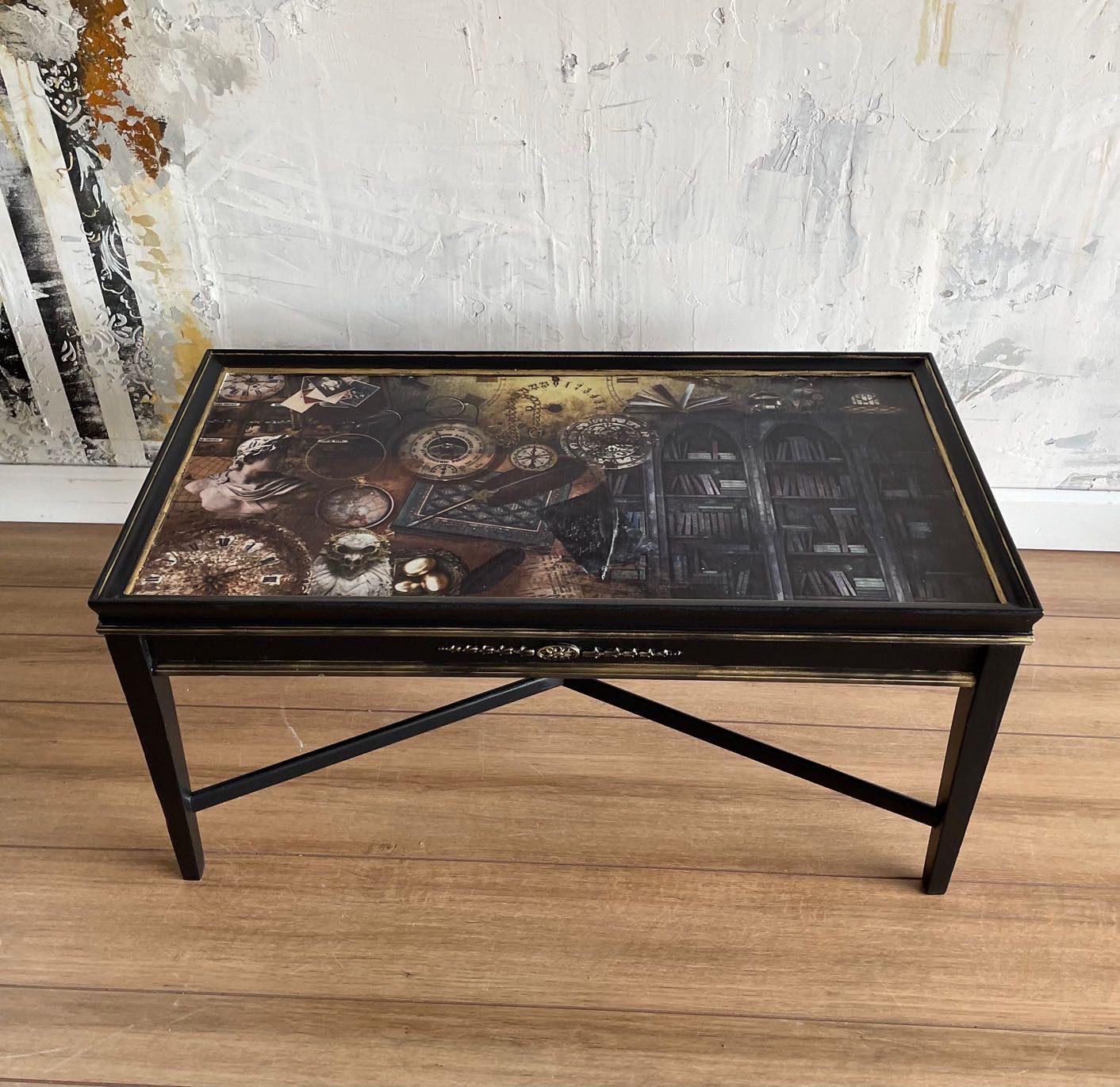 This one-of-a-kind coffee table features a hand-decoupaged tabletop inspired by vintage libraries, old-world curiosities, and classical art. The layered imagery includes antique clocks, timepieces, weathered bookshelves, sculptural busts, celestial and scholarly elements, and aged ephemera—arranged in a rich, moody collage that feels both intellectual and dramatic.