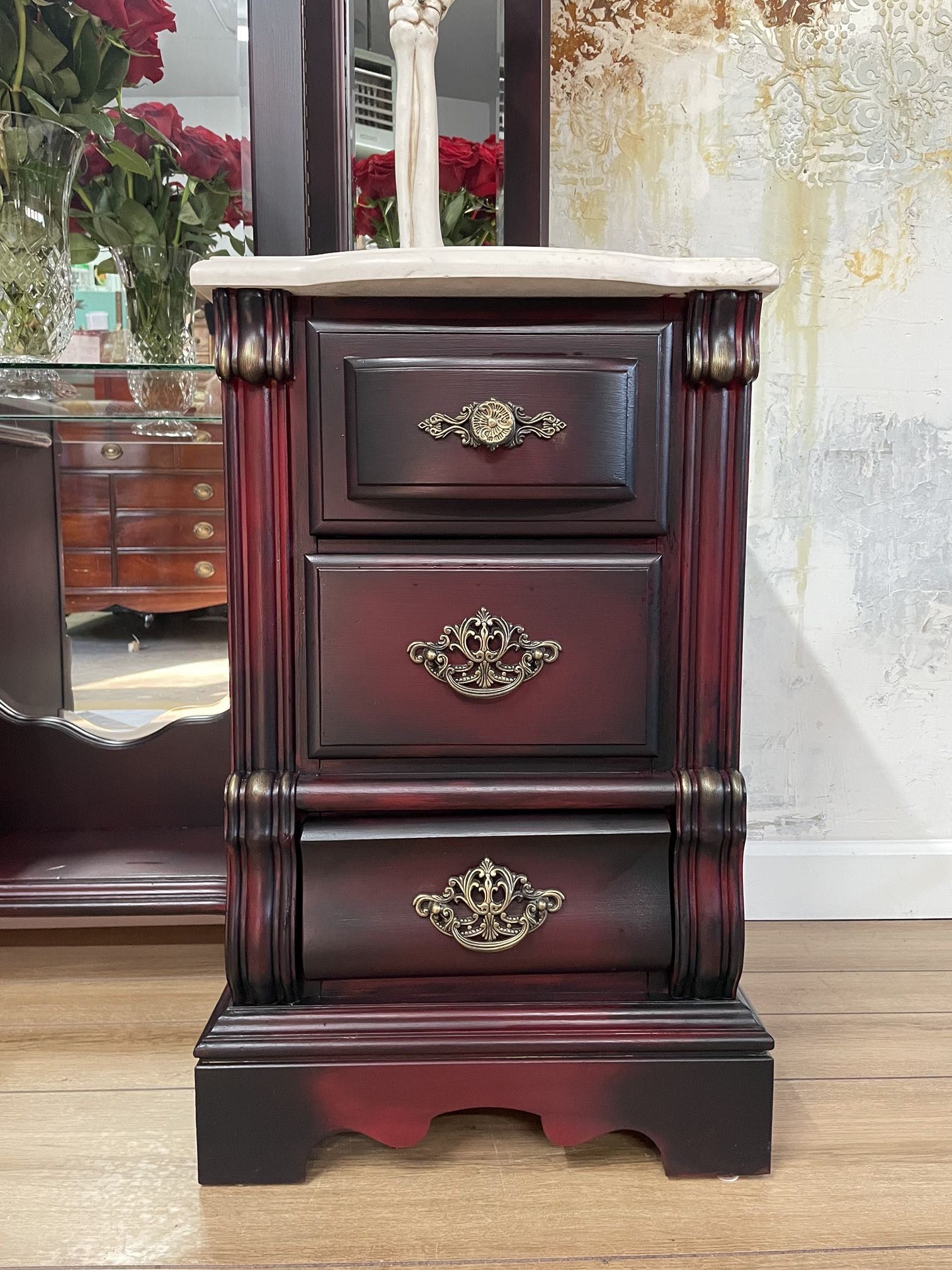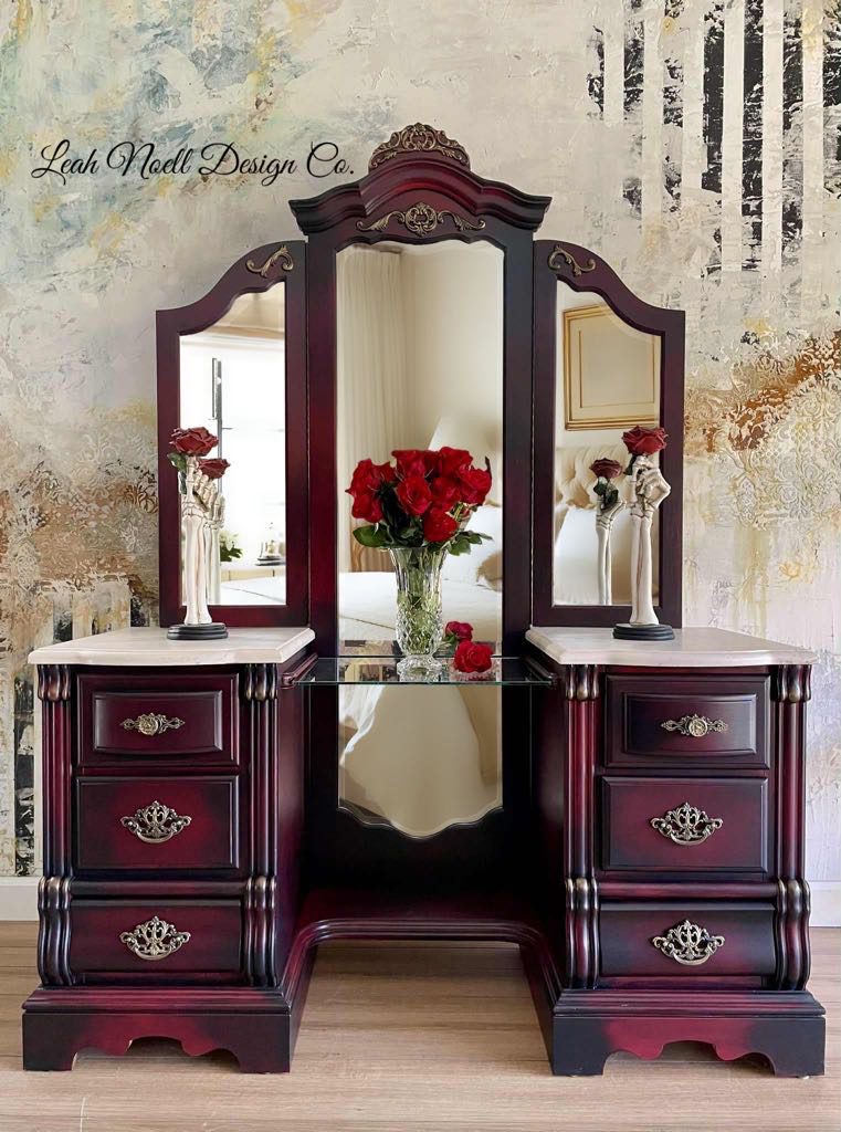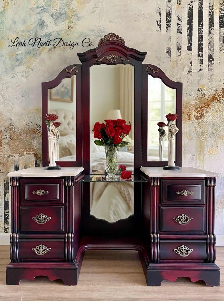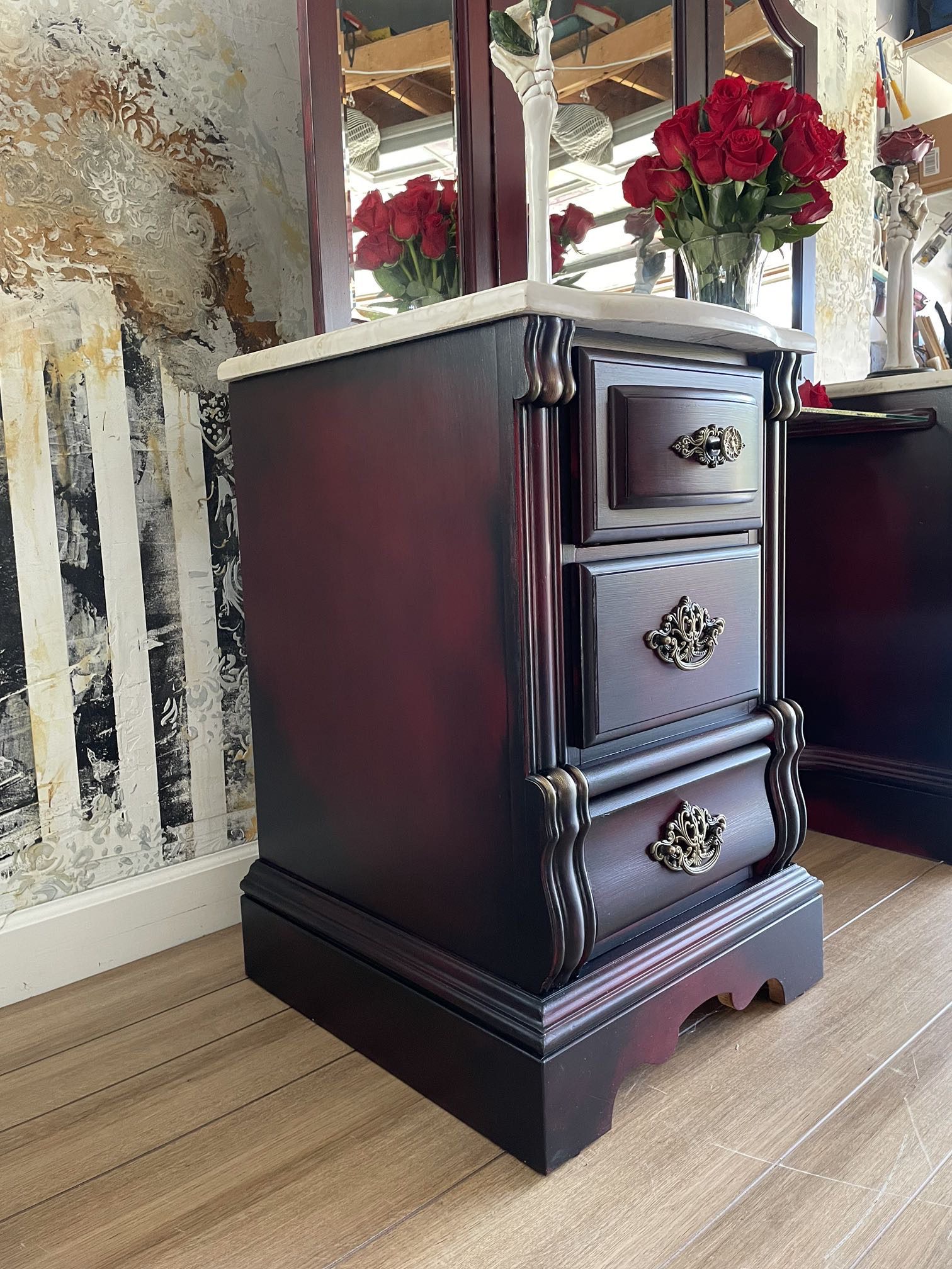 Originally crafted by Stanley Furniture, this solid wood vanity has been reborn through rich artistry and intricate detail. Hand-painted in deep crimson and black, every blend and shadow was carefully created to evoke the dark academia aesthetic — a reflection of moonlight and blood, strength and desire.