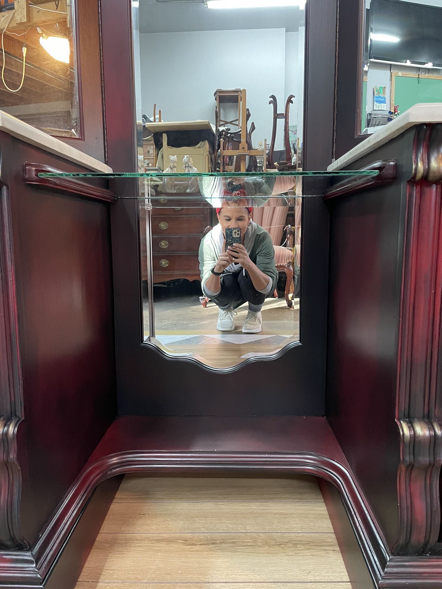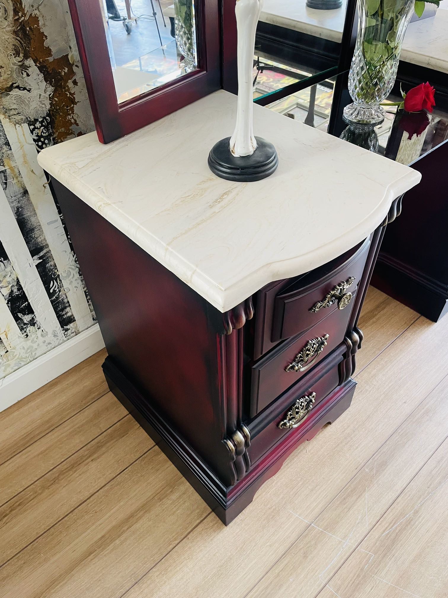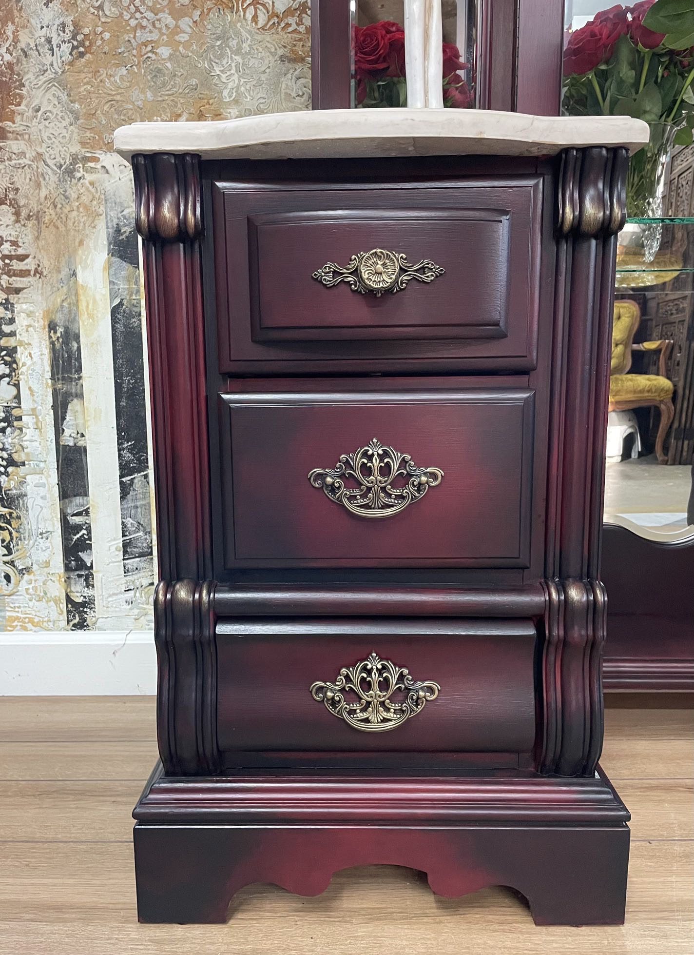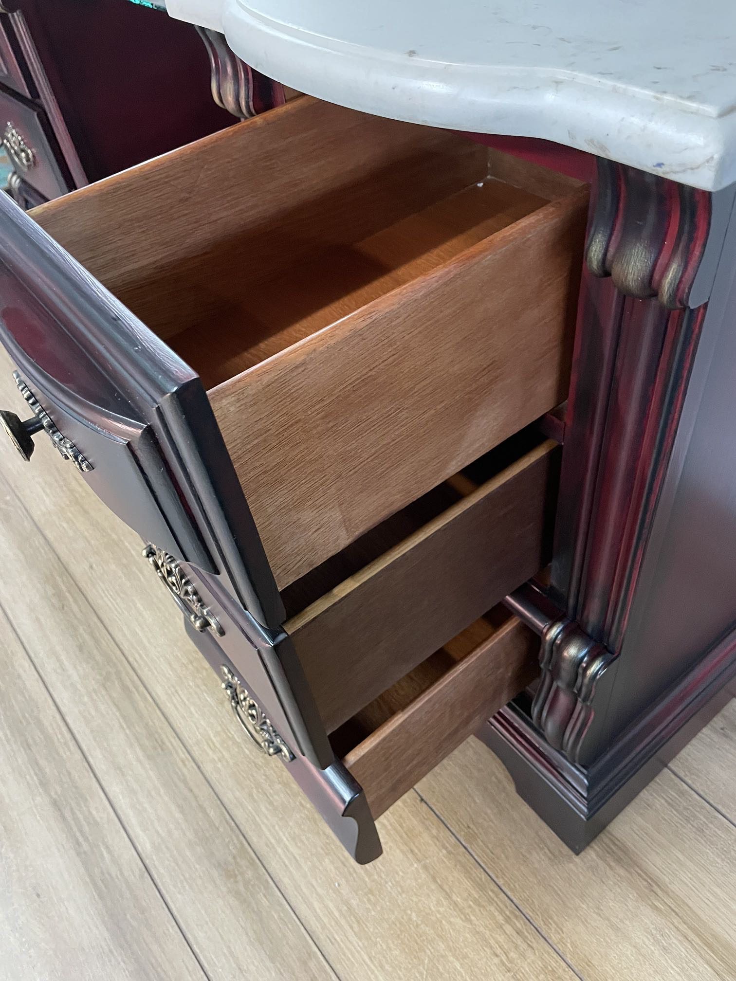 Originally crafted by Stanley Furniture, this solid wood vanity has been reborn through rich artistry and intricate detail. Hand-painted in deep crimson and black, every blend and shadow was carefully created to evoke the dark academia aesthetic — a reflection of moonlight and blood, strength and desire.